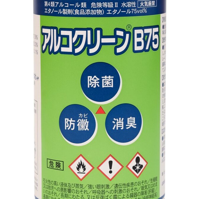 アルコクリーンB75は、食品や調理器具にかかっても安心な食品添加物品のアルコール製剤です。